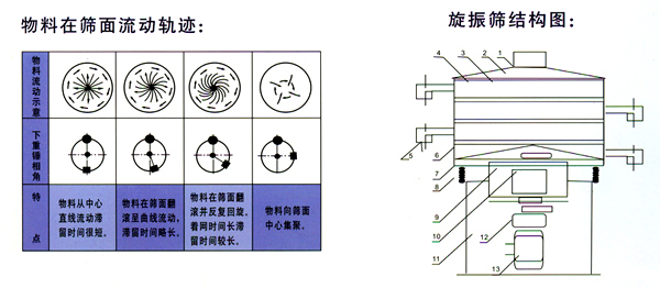 篩體的激振源裝在篩子底部,篩底之上裝有各層篩框及篩網(wǎng)架,各部件緊固后形成整體參振,參振部件由彈簧隔振支撐(橡膠彈簧或圓柱螺旋彈簧)。物料由篩頂部中間孔給料, 排料口在各層篩框側面, 可任意改變位置??臻g相位角與篩面上物料的運動軌跡見圖示。